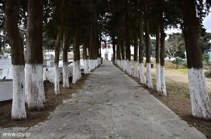 Θυμάμαι πόσο γραφική, πόσο τελετουργική, πόσο ιερή ήταν η μεταφορά του νεκρού μέσα από αυτόν τον διάδρομο ανάμεσα από 100 περίπου ψηλά κυπαρίσσια, που σαν αψίδα έμοιαζαν να αποτίουν τιμές στον νεκρό, λέω περίπου 100 γιατί στις μέρες μας έχουν μείνει μόνο 37 κυπαρίσσια από την δυτική μεριά και 46 από την ανατολική μεριά, χωρίς όμως να έχει επηρεαστεί το μήκους του διαδρόμου, είναι εμφανή τα σημεία που υπήρχαν τα κυπαρίσσια, διότι από την ανατολική πλευρά έγινε η επέκταση του κοιμητηρίου και έτσι για να φτιάξουν μεγαλύτερα ανοίγματα έκοψαν 4, ενώ από την δυτική πλευρά έκοψαν 13 συνολικά.