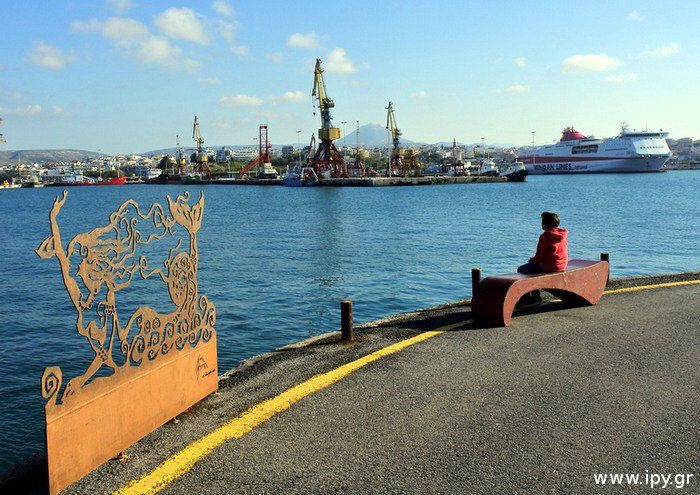 Μία γοργόνα που αποχαιρετά και καλωσορίζει τα πλοία και τους επιβάτες, κοσμεί το τμήμα της διαπλάτυνσης στην πλατεία του βόρειου λιμενοβραχίονα στο λιμάνι του Ηρακλείου.