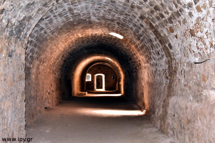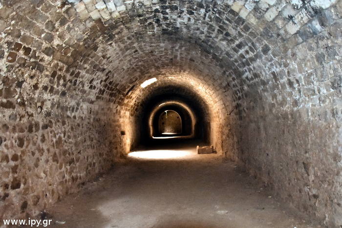 Το βασικό συγκρότημα αποθηκών του φρουρίου είναι κατασκευασμένο κατά μήκος του βόρειου τείχους, στο τμήμα ανάμεσα στις αιχμές της Αγίας Ιουστίνης και του Αγίου Σώζοντος. Οι λόγοι που επέβαλαν την ανέγερσή τους στο σημείο αυτό ήταν από τη μια η μεγάλη απόσταση από την επικίνδυνη και περισσότερο ευάλωτη νότια πλευρά του τείχους και από την άλλη η εγγύτητά του με τη βόρεια πυλίδα απ’ όπου γινόταν ευκολότερα ο ανεφοδιασμός του φρουρίου, μια και υπήρχε μονοπάτι που τη συνέδεε άμεσα με την ακτή. Η θέση των αποθηκών παρέμεινε σταθερή όχι μόνο στα χρόνια της βενετοκρατίας αλλά και κατά την τουρκοκρατία, όπως αποδεικνύεται από όλα τα σχεδιαγράμματα της Φορτέτζας. Το συγκρότημα θεμελίωσε το 1584 ο ρέκτορας Anzolo Barocci και τις τελευταίες επεμβάσεις έκανε ο ρέκτορας Nicolo Priuli το 1591.