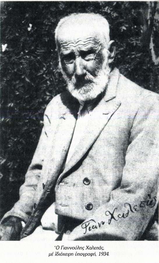 «Βιαστικός, σκυφτός, με το σακάκι του ριγμένο στον ώμο, γυρίζει μέσα στους μαρμαροστρωμένους δρόμους του μικρού χωριού του, σαν κάτι να γυρεύει — ο νους του μες σε λαγκάδια σκοτεινά και σε αβύσους περιπατεί. Έχει στιγμές που του έρχεται το λογικό, μα οι στιγμές αυτές δεν ζουν περισσότερο από της αστραπής τη λάμψη! — Στέκεται στο καφενείο, χαράζει δυό-τρεις γραμμές απάνω στου τραπεζιού το μάρμαρο, για να φύγει έπειτα πιο λυπημένος, γιατί το βλέπει κι’ αυτός πως οι γραμμές πούσυρε, δεν μοιάζουν με τις παλιές του κονδυλιές. Ημέρες πολλές κλεισμένος μέσα στο κάτασπρο και ποιητικό σπιτάκι του πλάθει-πλάθει μελαγχολικά τον κόκκινο πηλό του, για να ειδή ο διαβάτης που περνά έπειτα σε λίγο, σκορπισμένο σ’ άμέτρητα ξερά κομμάτια, μέσα στα όμορφα λουλούδια της αυλής του, το άψυχο αυτό της γης ζυμάρι και αυτόν τον δυστυχισμένο με μία μεγάλη στάμνα στον ώμο να κουβαλάει νερό στις γειτονιές από τη μαρμαρένια βρύση του χωριού του. Μόνο η μεγάλη καρδιά του καλλιτέχνη, η γεμάτη από αισθήματα ευγενικά του έχει μείνει άθικτη, — γιατί όταν η άμοιρη και πονεμένη μάνα του θελήσει να πουλήσει κανένα από τα λίγα πρόβατα που βόσκει ο «Μπάρμπα-Γιαννούλης» (μ’ αυτό το όνομα είναι στο χωριό γνωστός), του το κρύβουν, δεν του το λένε, του λένε πως χάθηκε. Και τότε-τότε αρχίζει η μεγάλη τραγωδία, γυρίζει, τρέχει από δω κι’ άπεκεί μέσ’ στις βοσκές του Πανόρμου, φωνάζει, κλαίει, για τον καλό του σύντροφο, για το προβατάκι που έχασε και μόνο ο αντίλαλος του μοιρολογιού ακούγεται μακριά μες από τις βαθιές χαράδρες, και άπ’ τα χορταριασμένα βράχια του ωραίου του νησιού…». Στο τέλος του άρθρου ο γλύπτης Σώχος ρίχνει την ιδέα να βάλουν το Χαλεπά σ’ ένα θεραπευτήριο, μήπως και γένει εντελώς καλά.