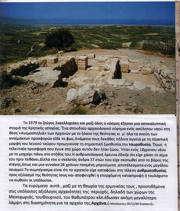 To 1979 το ζεύγος Σακελλαράκη και μαζί όλος ο κόσμος έζησαν μια αποκαλυπτική στιγμή της Κρητικής ιστορίας. Ένα σπουδαίο αρχαιολογικό εύρημα ενός ασύλητου ναού στη θέση «Ανεμόσπηλια» των Αρχανών με το ξόανο της θεότητας κι μ΄ όλα τα σκεύη των αναίμακτων προσφορών είδε το φως. Ανάμεσα τους δεκάδες πήλινα αγγεία με τη πλαστική μορφή του λευκού ταύρου προμηνούσε τη σημαντική ζωοθυσία, την ταυροθυσία. Όμως η τελευταία προσφορά που έγινε στο χώρο αυτόν δεν ήταν ζώου. Ήταν ενός Ι8χρονου νέου με το μαχαίρι πάνω στο στήθος του. Η ανθρωπολογική έρευνα έδειξε ότι είχε χάσει το αίμα του πριν πεθάνει. Δίπλα του ο σκελετός άνδρα 37 ετών που είχε σκοτωθεί από το βάρος της στέγης, όπως και μια γυναίκα 28 χρόνων πεσμένη μπρούμυτα, αποτέλεσμα ενός μεγάλου σεισμού. Το συμπέρασμα είναι ότι το ιερατείο είχε καταφύγει στη τέλεση ανθρωποθυσίας προς εξιλασμό της θεότητας ίσως και αποφευχθεί η επερχόμενη καταστροφή ή τουλάχιστο να σωθούν οι υπόλοιποι.
