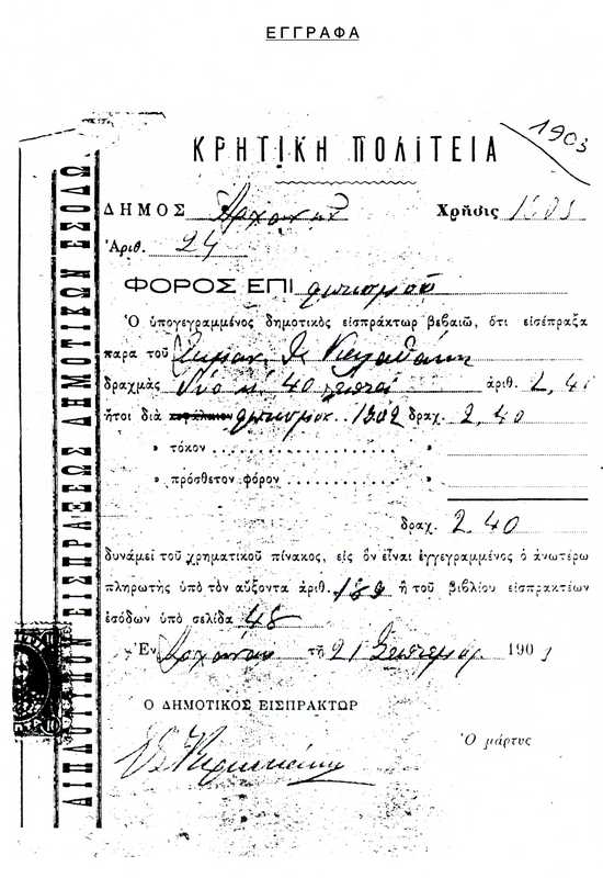 7Βλ. συμβόλαιο του Συμβολαιογράφου Αρχανών Νικολάου Αντ. Χριστινίδη με αρ. 8242/26-04-1925. Πωλητήριο 25.000 δρχ.
