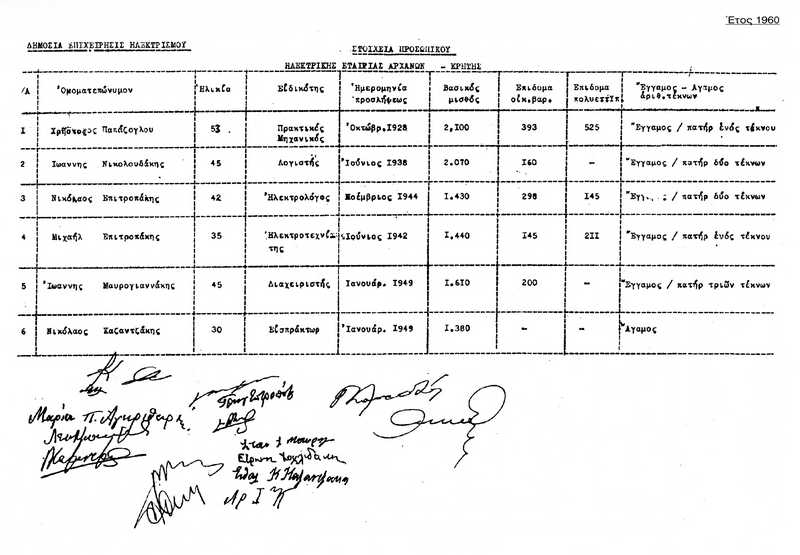 Υποσημείωση σελίδας 55Το προσωπικό που διατηρούσε η Ηλεκτρική Εταιρεία Αρχανών κατά τον χρόνο εξαγοράς της από τη Δ.Ε.Η. ήταν οι παρακάτω: Ο μηχανικός Χρήστος Παπάζογλου, ηλικίας τότε 53 ετών, ο λογιστής Ιωάννης Νικολουδάκης, ηλικίας τότε 45 ετών, ο ηλεκτρολόγος Νικόλαος Επιτροπάκης, ηλικίας τότε 42 ετών, ο ηλεκτροτεχνίτης Μιχαήλ Επιτροπάκης, ηλικίας τότε 35 ετών, ο διαχειριστής Ιωάννης Μαυρογιαννάκης, ηλικίας τότε 45 ετών, και ο εισπράκτορας Νικόλαος Καζαντζάκης, ηλικίας τότε 30 ετών. Αναλυτικό πίνακα όλων των παραπάνω, με τα χρόνια υπηρεσίας και τις αποδοχές τους, καταχωρούμε στο μέρος των εγγράφων.