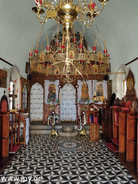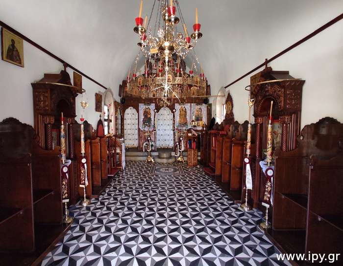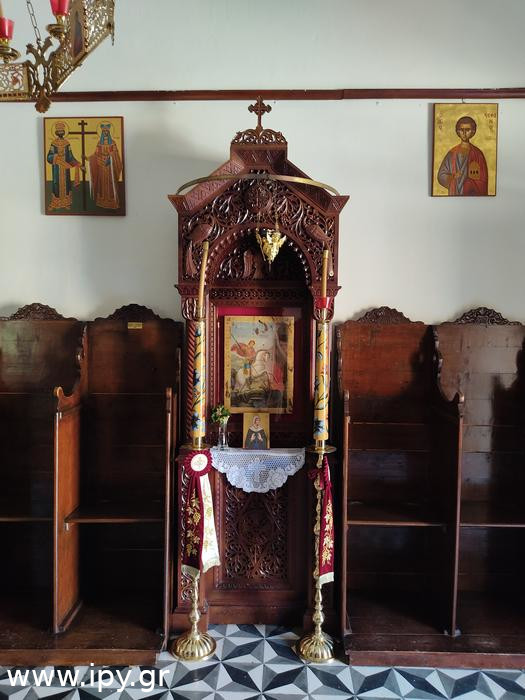 Η μορφή του θυρώματος και οι πεσσοί στις γωνίες από λαξευτό πωρόλιθο, αποτελούν στοιχεία της παράδοσης, που είχε επικρατήσει στον Αποκόρωνα από την εποχή της βενετοκρατίας. Το ξυλόγλυπτο τέμπλο είναι απλό με καλές εικόνες, αφιερώματα των μοναχών της Αγίας Τριάδος, έργα του ζωγράφου Ξενοφώντα Παπαδάκη, που αξιοποιεί εικονογραφικά πρότυπα της όψιμης Κρητικής Σχολής. Η εικόνα του Αγίου Γεωργίου με σκηνές από το βίο του, είναι καλυμμένη με ασημένια επένδυση.