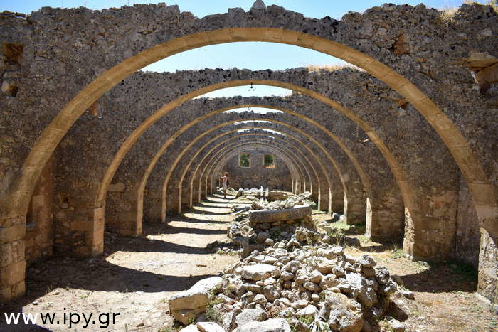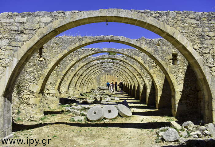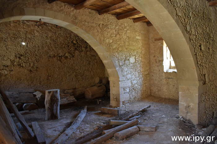 To ελαιοτριβείο, που διατηρεί την αρχιτεκτονική παράδοση της βενετοκρατίας, ολοκληρώθηκε το 1863. Είναι ένα εντυπωσιακό επίμηκες κτίσμα στη νότια πλευρά του συγκροτήματος, η στέγη του οποίου στηριζόταν σε δεκατρία ημικυκλικά τόξα (καμάρες). Με τον τρόπο αυτό τα δοκάρια μεταξύ των τόξων θα ήταν μικρότερα και το δώμα πιο ανθεκτικό. Στο εσωτερικό είχε τέσσερις ελαιόμυλους που ο καθένας είχε τέσσερις μυλόπετρες (σήμερα σώζονται μόνο οι βάσεις και μερικές μυλόπετρες).