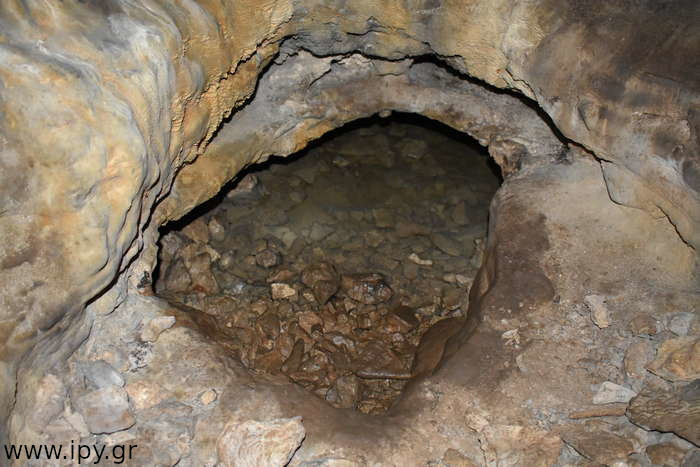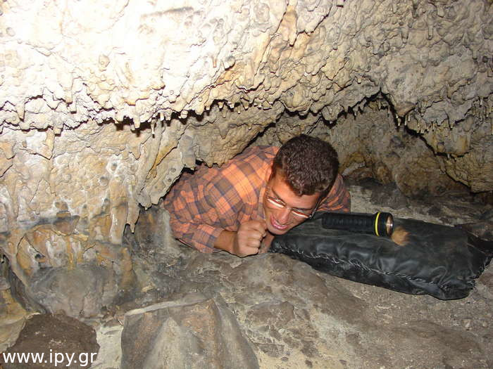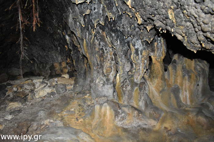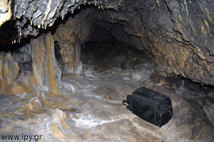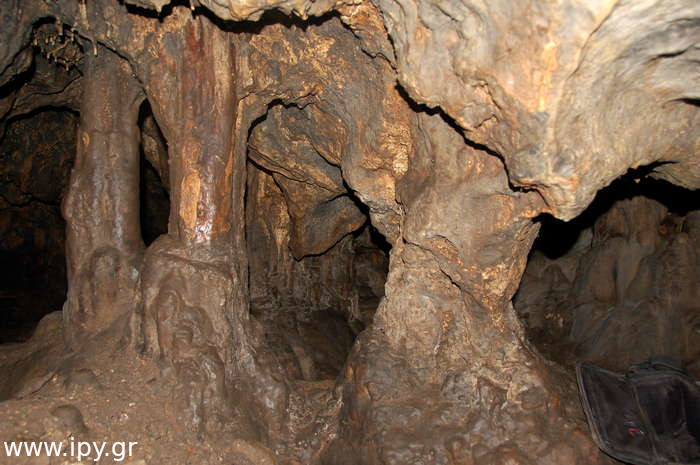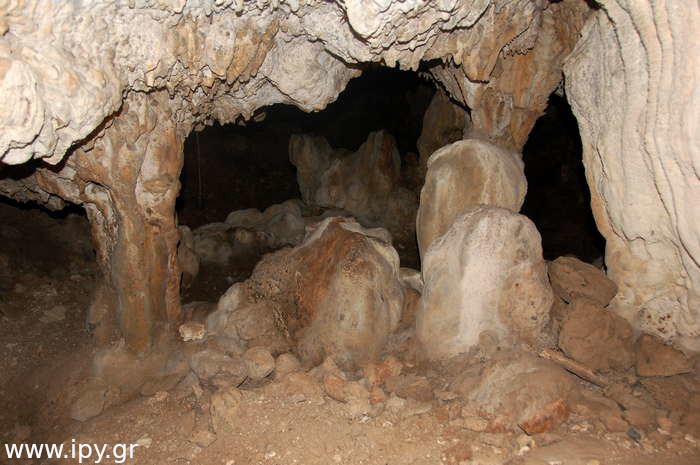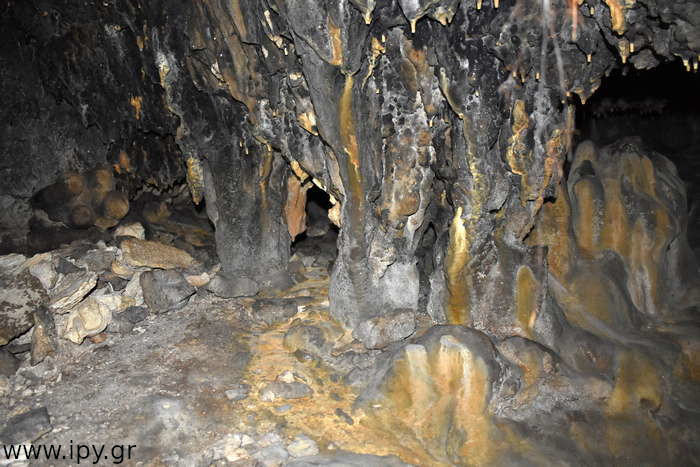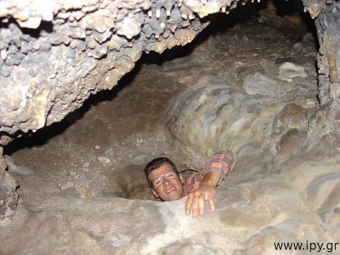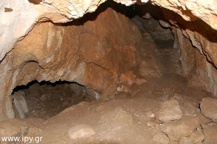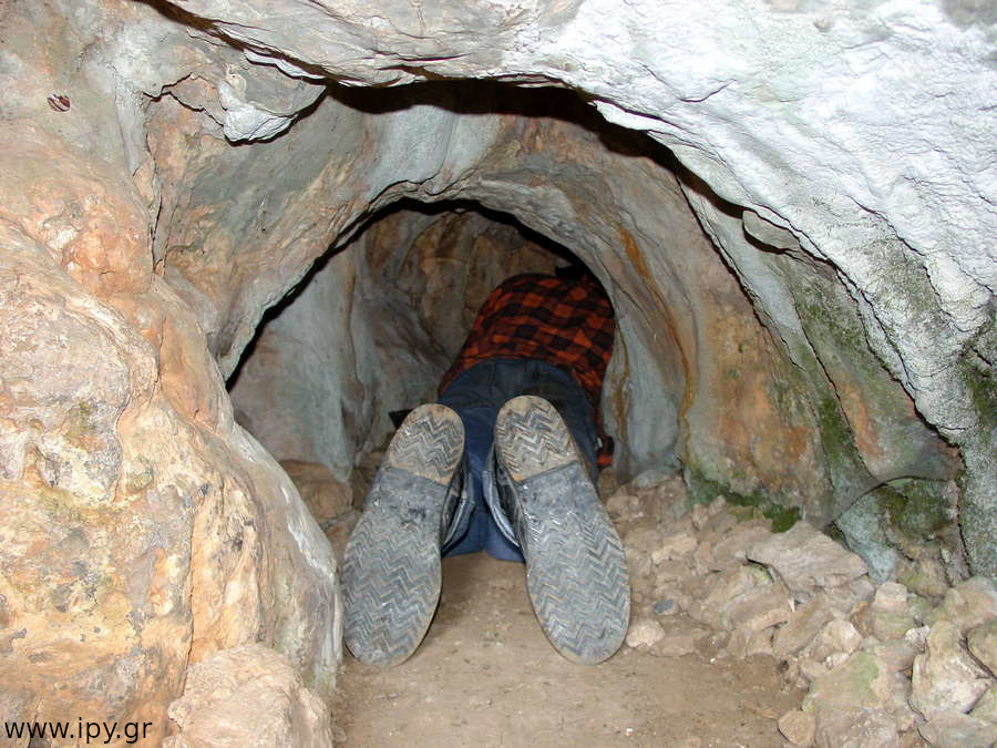 Στην πρώτη σήραγγα δεν έχω εισέλθει ποτέ γιατί δεν έτυχε, ίσως αποτελέσει κίνητρο για μελλοντική εξερεύνηση. Η δεξιά σήραγγα είναι αρκετά στενή, περίπου 5 μέτρα μήκος αλλά βατή, η οποία οδηγεί σε ένα μεγάλο θάλαμο, λέγοντας μεγάλο εννοώ ότι μπορείς να κινείσαι με τα γόνατα. Μόλις προβάλεις εκεί βλέπεις αριστερά σου την σήραγγα που είχες παρακάμψει πριν, χωρίς όμως να υπάρχει κάποιο ρεύμα αέρα η κάτι άλλο που να φαίνεται ότι είναι η ίδια σήραγγα, αυτό μπορεί να σημαίνει ότι υπάρχουν διακλαδώσεις διαδρόμων.