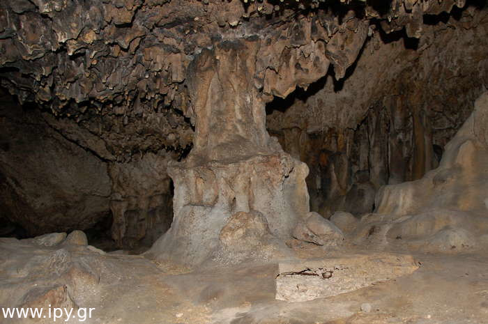 Λίγο μετά από αυτό το στενό πέρασμα απλώνεται μπροστά σου ένας άνετος θολωτός διάδρομος που σου επιτρέπει να κάθεσαι, αλλά και να περπατάς στα γόνατα, δεξιά σου συναντάς μερικές κολώνες από ενωμένους σταλακτίτες και σταλαγμίτες, εσοχές με πολλές μικρότερες τρύπες που δεν χωράει άνθρωπος, ενώ παντού στην οροφή υπάρχουν λευκοί σταλακτίτες. Στο βάθος αριστερά σε απόσταση 12 περίπου μέτρα από την είσοδο, υπάρχει κάτι σαν μεγάλη κεντρική κολώνα.