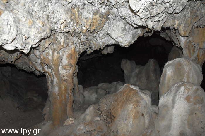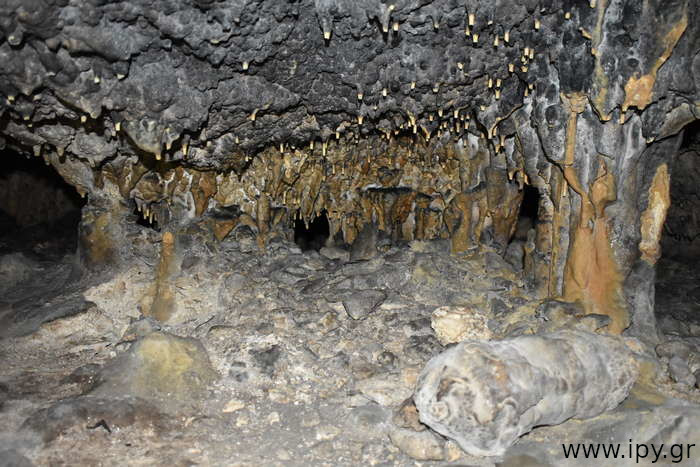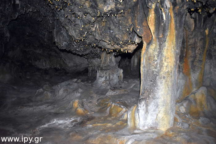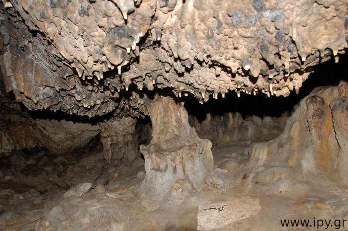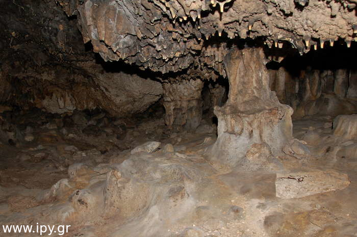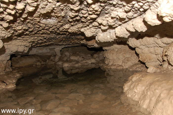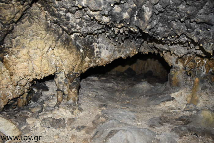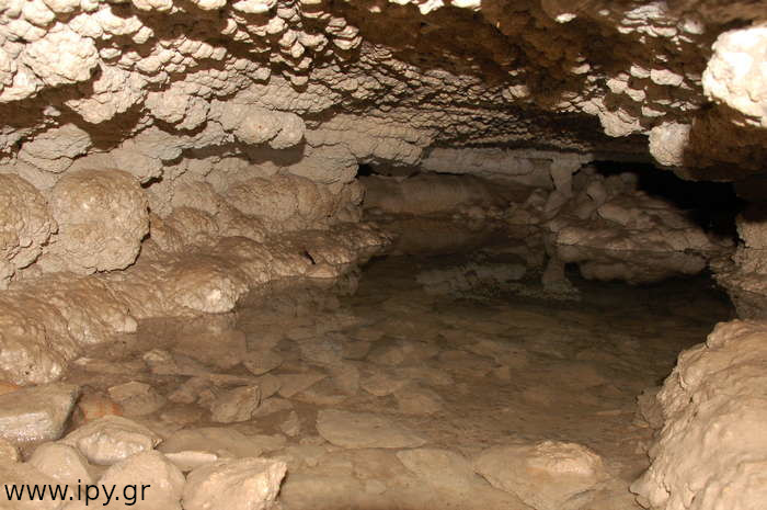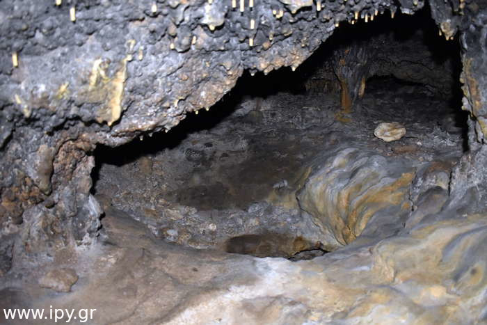 Αριστερά αμέσως μετά το σιφόνι, υπάρχει ένα ακόμη στενότερο πέρασμα από το πρώτο, μόλις το περάσεις θα βρεθείς σε μια μεγάλη και άνετη σχετικά αίθουσα που μπορείς να καθίσεις άνετα. Όλες τις φορές που έχω μπει στο σπήλαιο ήταν μετά το καλοκαίρι, το σπήλαιο με εξαίρεση την δεξαμενή που ανέφερα ήταν ξερό, τα ίχνη όμως από την υγρασία μαρτυρούν πως κάθε βαθούλωμα στο έδαφος τον υπόλοιπο χρόνο θα είχε αρκετό νερό. Αναρίθμητοι φαντάζουν οι μικροί λευκοί σταλακτίτες μέχρι δύο τρία εκατοστά το πολύ, τόσο είναι στα σημεία που δεν έχουν σπάσει, διότι σπάνε πολύ εύκολα.
