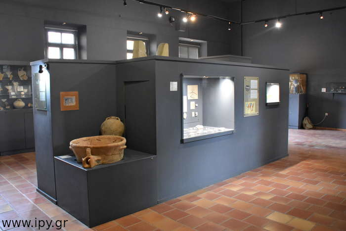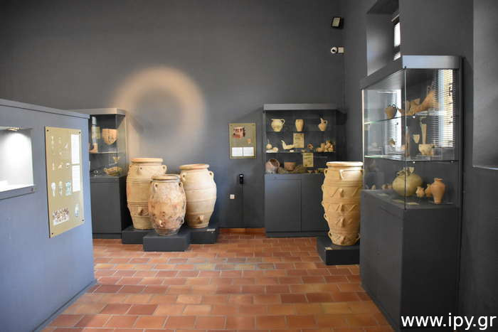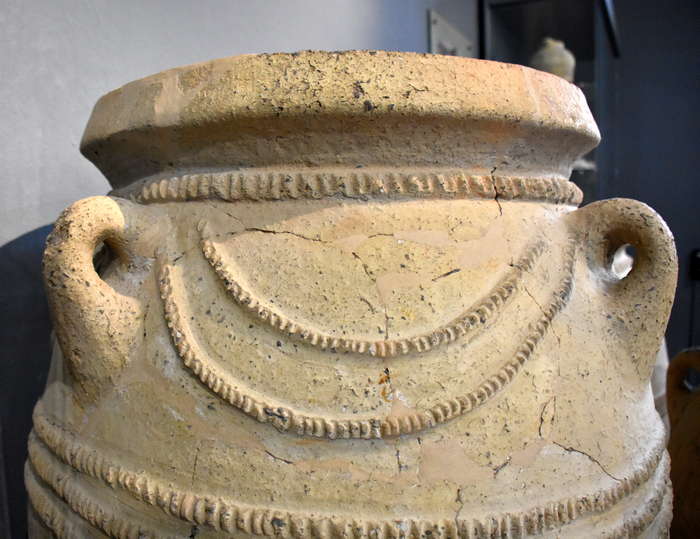 Ο αμφορέας που εκτίθεται δίπλα, των ίδιων χρόνων, από το ανακτορικό κτήριο στην Τουρκογειτονιά, πιθανότατα χρησίμευε και για την αποθήκευση κρασιού.