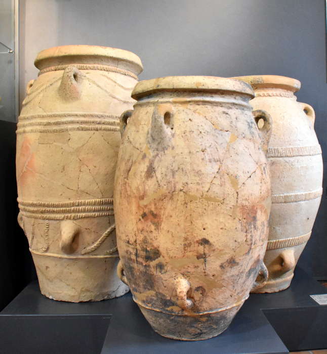Πίθοι από το κεντρικό δωμάτιο του μινωϊκού ναού στα Ανεμόσπηλια, γύρω στο 1700-1650 π.Χ. Ο μικρός πίθος με την πολύχρωμη καμαραϊκή διακόσμηση αλλοιώθηκε -από την πυρκαϊά, που ακολούθησε τον σεισμό.