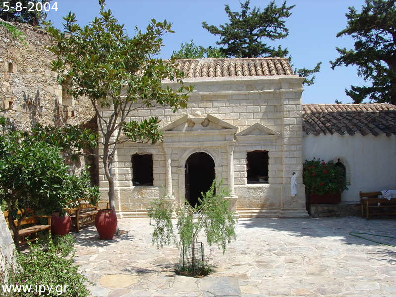Μέχρι το 1635 υπήρχε ο αρχικός ναΐσκος (Γενέσιο Τιμίου Προδρόμου, 24 Ιουνίου) με ελάχιστα χαμηλά κελλιά στα δυτικά του, ασφαλώς σ’ έναν πολύ μικρότερο χώρο, προσφερόμενο πάντως για την ίδρυση ενός εντυπωσιακού αρχιτεκτονικά και λειτουργικά κτηριακού συνόλου. Ο αρχικός ναΐσκος, στη θέση του βορειοανατολικού κλιτούς του σημερινού ναού, προϋπήρχε της Μονής και δεν αποκλείεται η πρώτη κτίση του να φθάνει ως και την Υστεροβυζαντινή περίοδο. Ο Μιχ. Μ. Παπαδάκης κατέγραψε παλιά παράδοση σύμφωνα με την οποία όταν ήλθε ο ανακαινιστής Παχώμιος στον χώρο αυτόν βρήκε μικρό εκκλησάκι βυζαντινό τοιχογραφημένο στη θέση του σημερινού ναού και ότι από το παλαιό εκκλησάκι παρέμεινε η μικρή βορεινή είσοδος με το υπέρθυρόν της και στο εσωτερικό του διασώθηκε μόλις διακρινόμενη τοιχογραφία της Θεομήτορος με το Θείο Βρέφος.