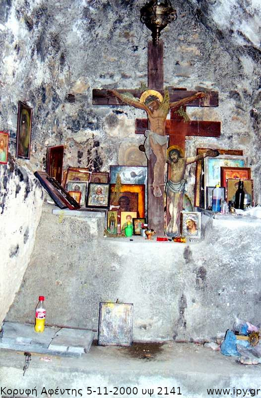 Οι επιφάνειες των τοίχων είναι χαλικολογημένες χωρίς σοβά, το δε δάπεδο σχηματίζεται από τον φυσικό βράχο, χονδροειδώς στρωμένο. Οι σκληρές συνθήκες που επικρατούν στην κορυφή δεν ευνοούν την διατήρηση εικόνων. Παλαιότερα το πρόβλημα είχε αντιμετωπισθεί με την κατασκευή δύο πέτρινων ανάγλυφων εικόνων από τις οποίες σήμερα σώζεται ένα τμήμα εντοιχισμένο κοντά στο αγιοθύριδο. Ο Ρ. Faure αναφέρει την ύπαρξη των ανάγλυφων αυτών στις αρχές της δεκαετίας του ’60.