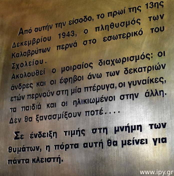 Εδώ το άραχλο πρωινό της 13ης Δεκεμβρίου 1943 οι Γερμανικές δυνάμεις Κατοχής συγκέντρωσαν τους κατοίκους των Καλαβρύτων και διαχώρισαν κατά τρόπο απάνθρωπο τις οικογένειές τους. Τα μεν γυναικόπαιδα τα κράτησαν έγκλειστα εν ομηρία για αρκετές ώρες στις αίθουσες του σχολείου, τους δε άνδρες και τους έφηβους τους οδήγησαν στο Λόφο του Καπή, όπου και άνανδρα τους εκτέλεσαν.
