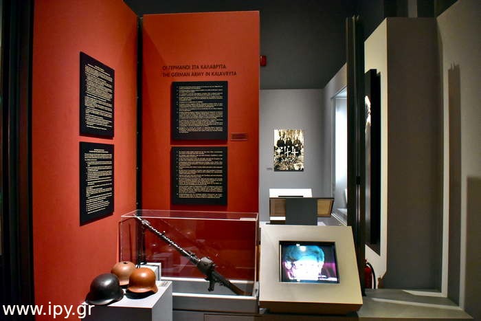 Αίθουσα 1″: Περιλαμβάνει πέντε υποενότητες: πληροφορίες για την πόλη των Καλαβρύτων και την ευρύτερη περιοχή, για την ιστορία του κτηρίου και το ρόλο του στα γεγονότα του Δεκέμβρη του 1943, για την κοινωνική και οικονομική ζωή της πόλης πριν την Κατοχή και τέλος, για τον πόλεμο και την Κατοχή στην Ελλάδα.